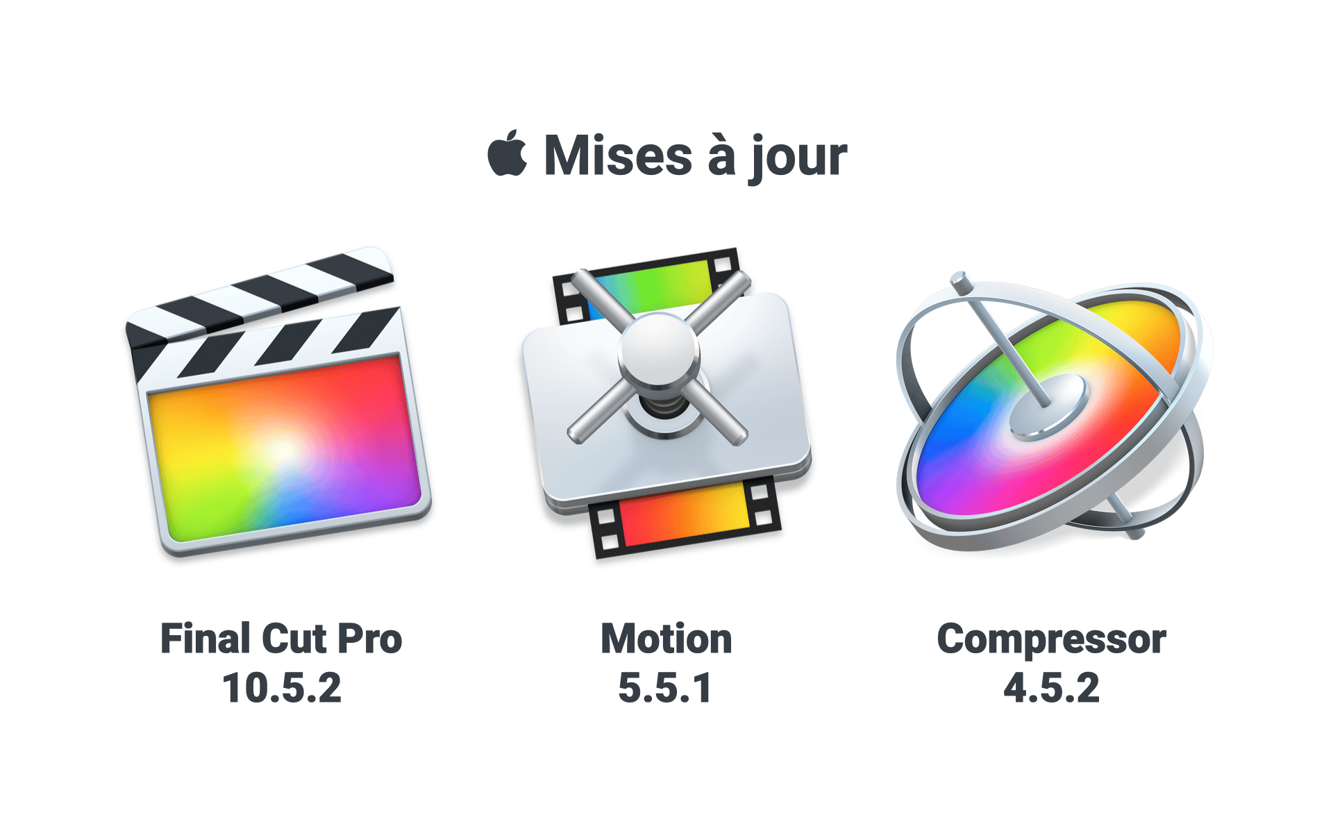 Apple met à jour sa suite logicielle dédiée à la vidéo, Final Cut Pro 10.5.2, Motion 5.5.1 et Compressor 4.5.2 sont donc les dernières versions disponibles sur l’Apple Store.